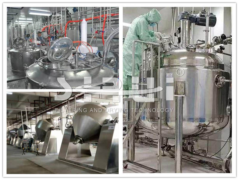 过滤洗涤干燥机(业内俗称“三合一”)能实现物料的过滤、洗涤、干燥、灭菌、卸料等连续工艺过程,其操作方式属于分批式操作(间歇操作),广泛应用于制药、食品、农药、化工等领域。过滤洗涤干燥机主要由承压部分的立式罐体、加热系统、搅拌系统(搅拌轴、搅拌桨、机械密封等)、搅拌升降机构、传动机构、过滤介质、出料阀、喷淋装置、灭菌装置、液压泵站、主电控柜(包括变频器、PLC)等部件组成,实现了机、电、仪一体化。
